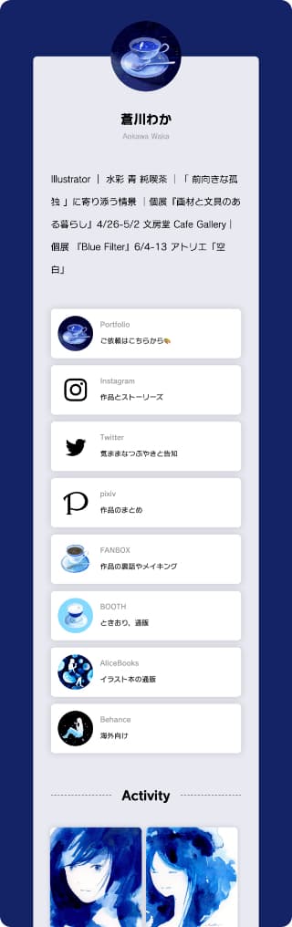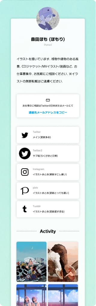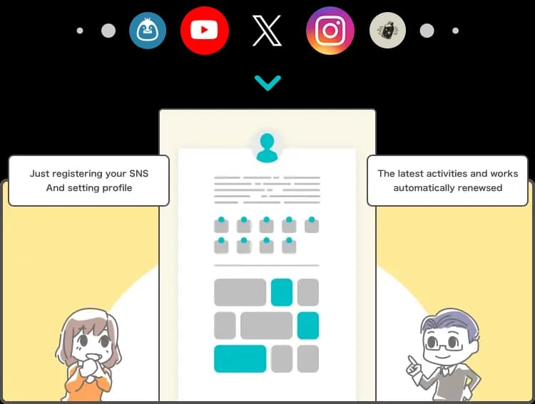 Welcome to POTOFU. POTOFU is a service that allows you to quickly and easily create your public profile by aggregating information on SNS and work posting sites just by setting up a few settings at the beginning. We support your activities by allowing you to share information on the latest works and activities with a single URL.